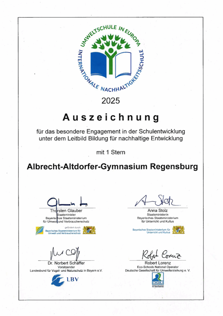 Das Albrecht‑Altdorfer‑Gymnasium Regensburg wurde 2025 als „Umweltschule in Europa – Internationale Nachhaltigkeitsschule“ mit 1 Stern ausgezeichnet.