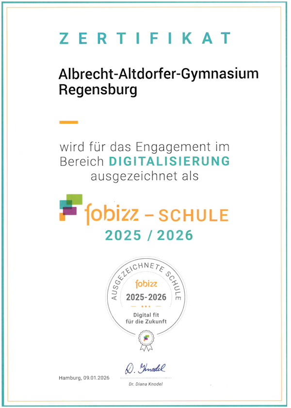 Für unser Engagement im Bereich der digitalen Bildung wurden wir, das Albrecht-Altdorfer-Gymnasium Regensburg, als „fobizz-Schule 2025/2026” ausgezeichnet.