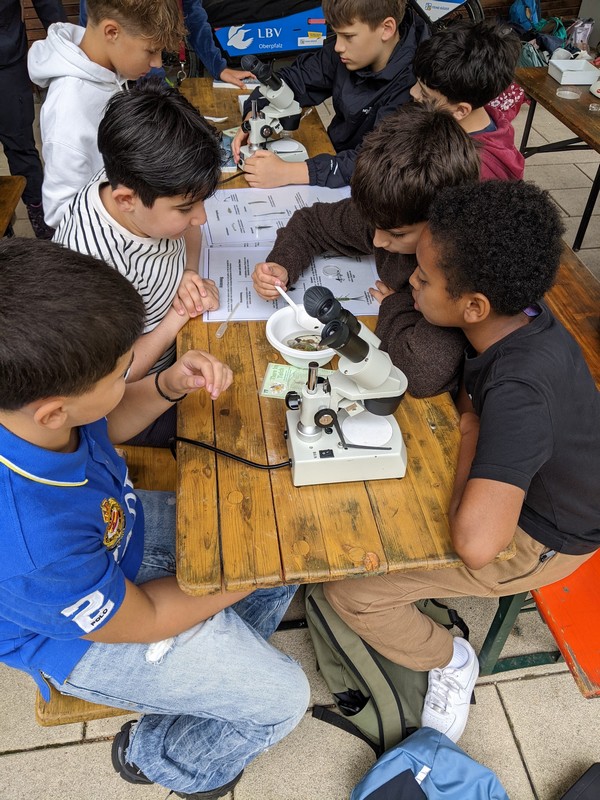 Am Fluss ging es zunächst auf Entdeckungstour: Mit Keschern wurden verschiedene Wasserbewohner wie Larven, Schnecken und Muscheln eingefangen, unter dem Binokular genau betrachtet, bestimmt – und selbstverständlich anschließend wieder freigelassen.