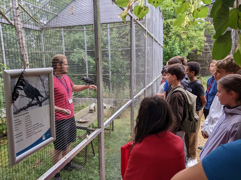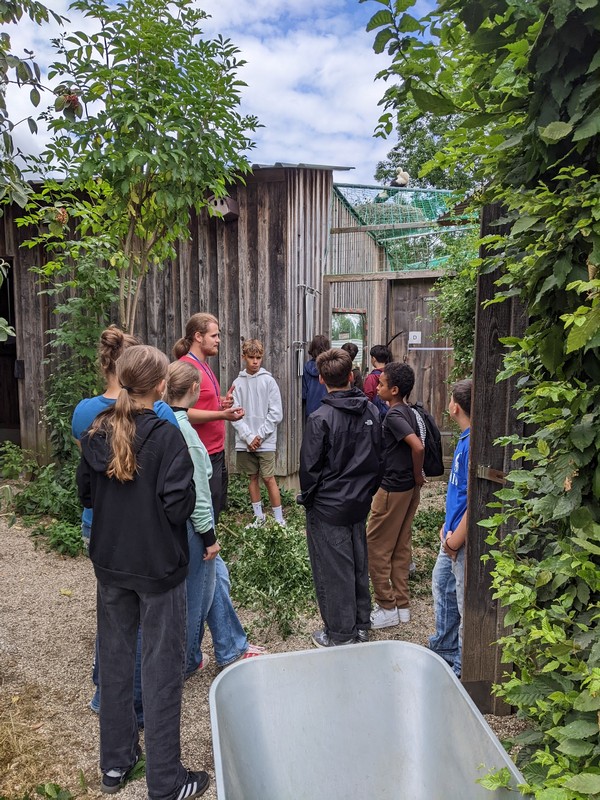 Anschließend stand die Vogelwelt im Mittelpunkt. In kleinen Spielen lernten die Schülerinnen und Schüler die Zugrouten des Storches kennen und übten sich in der Erkennung einheimischer Vogelarten und ihrer Rufe. Eine kurze Führung durch die Vogelstation rundete den Tag ab. Dort erhielten die Schülerinnen und Schüler spannende Einblicke in die Pflege verletzter oder verlassener Vögel – von angefahrenen Greifvögeln über aus dem Nest gefallene Jungtiere bis hin zu zwei mutterlosen Schwanenküken. Um die Tiere nicht zu stören, konnten die Kinder sie durch kleine Sichtöffnungen in den Wänden der überdachten Gehege beobachten.
