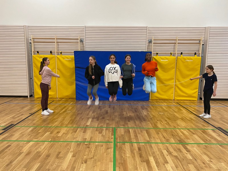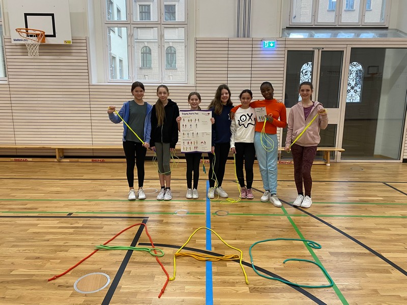 Neben theoretischen Inhalten, z.B. den Auswirkungen von Seilspringen auf das Herz-Kreislauf-System, erlernten und trainierten die Schülerinnen diverse Einzel-Tricksprünge (z.B. Hampelmann, Criss Cross), Partnersprünge und wetteiferten gemeinsam im langen Seil.