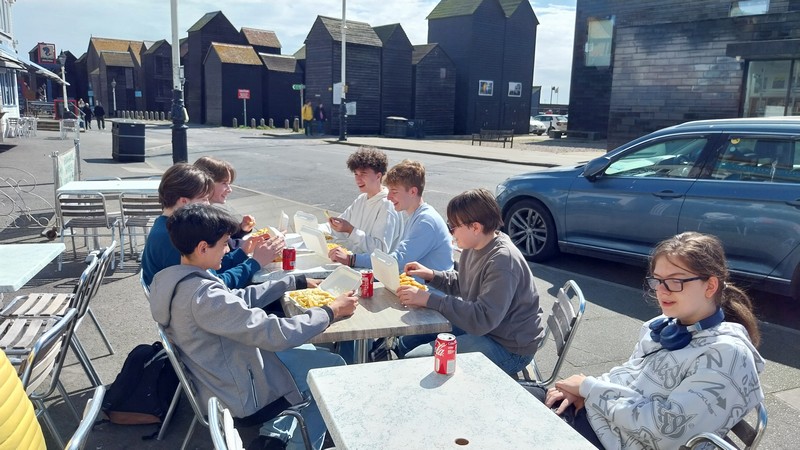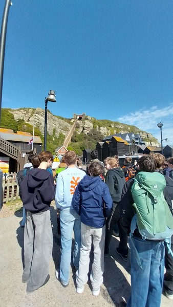 Die Schülerinnen und Schüler der 8. Jahrgangsstufe sind gut in Eastbourne angekommen und genießen den ersten Tagesausflug in Hastings bei strahlendem Sonnenschein.