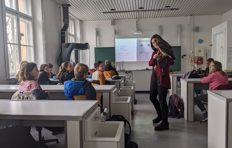 Auch über die Gefährdung und den Schutz der Tiere klärte Frau Eichenseer auf. Fasziniert waren die Kinder vom Ablauf der Jagd mit den Greifvögeln, für die ein Jagdschein benötigt wird. Erstaunt waren die Schüler:innen auch vom hohen Preis von mehreren Hundert Euro für einen Rotschwanzbussard, den Frau Eichenseer als günstig bezeichnet hat, da er im Vergleich zu anderen Greifvögeln und Falkenartigen eher niedrig ist. Für einen weißen Gerfalken aus den USA, die mehrere zigtausend Euro kosten, wurden bei einer Auktion in Saudi-Arabien 2021 über 400.000 Euro bezahlt!