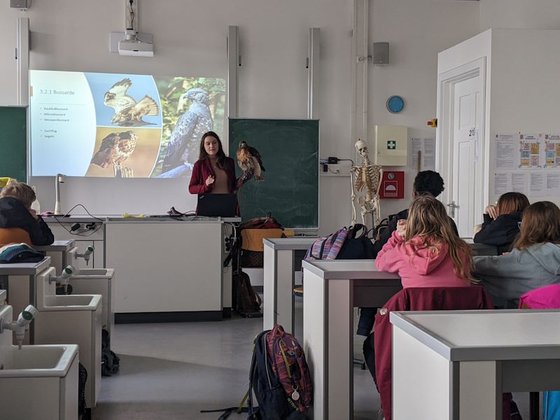 Am vergangenen Dienstag besuchte uns die Cousine einer Schülerin mit einem außergewöhnlichen Gast: Frau Rebecca Eichenseer, Hobbyfalknerin, nahm sich die Zeit, der Klasse einen ihrer Raubvögel vorzustellen, den Rotschwanzbussard „Toni“.